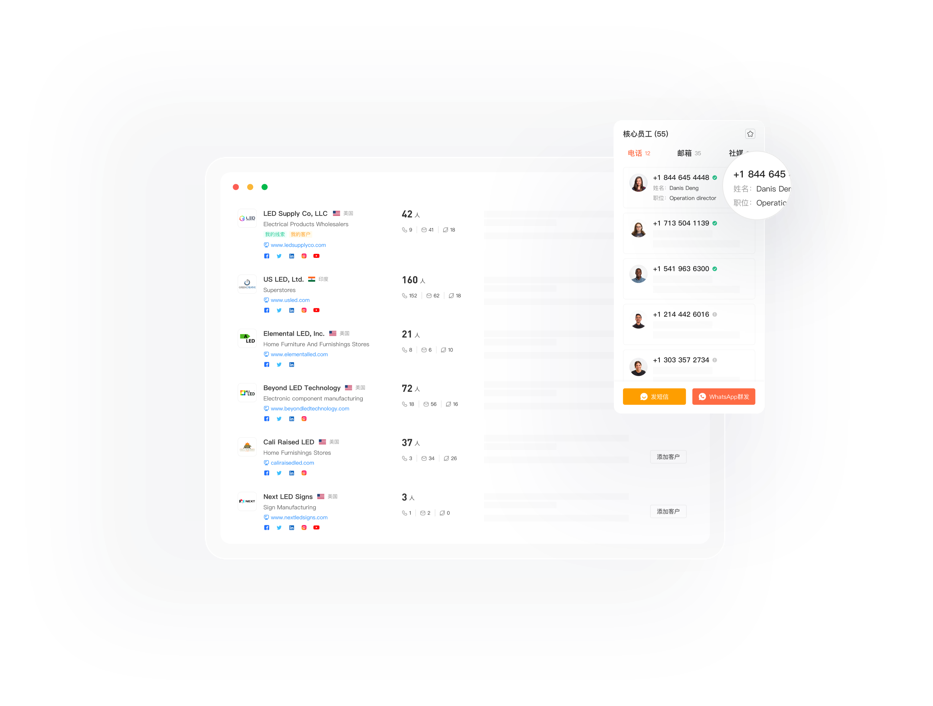 企业核心员工电话、邮箱、社媒信息一览无疑,一键群发效率高又快。