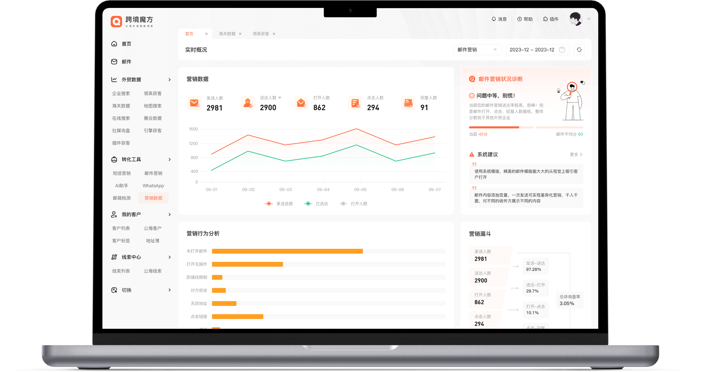 提供海量精准邮箱地址,满足多场景个性化营销,邮件送达率、打开率和点击率可视化呈现,实时分析客户行为,展示营销效果,并支持接收客户回复邮件。