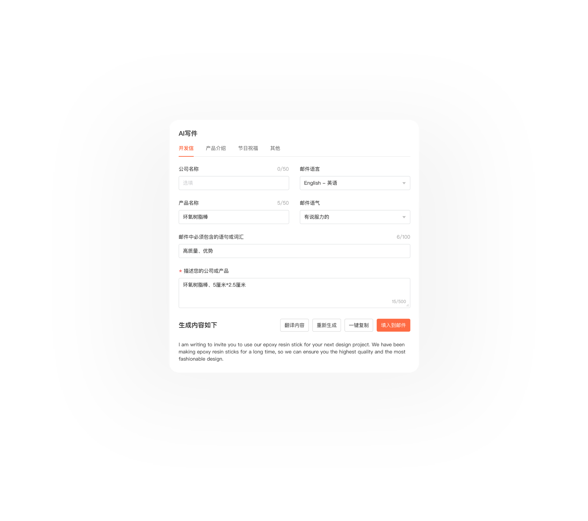 根据自定义的内容要素和语气,ai极速创建契合外贸业务的开发信,帮助提升送达率。