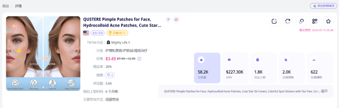视频同款“星星痘贴”所属小店mighty life非常善于通过达人合作的方式盘活社媒流量,小店目前总成交金额达222万美金,其中195万美金的创收来自达人带货渠道,占比近9成。“星星痘贴”是小店内排榜第二的热销产品,价格为3.49美金,该产品5月5日出货9200单,截至目前上线6个月左右,累计售出5.95万单,而仅在过去30天销量就达5.82万单,可见近一个月销量暴增,红人带货效果显著。
