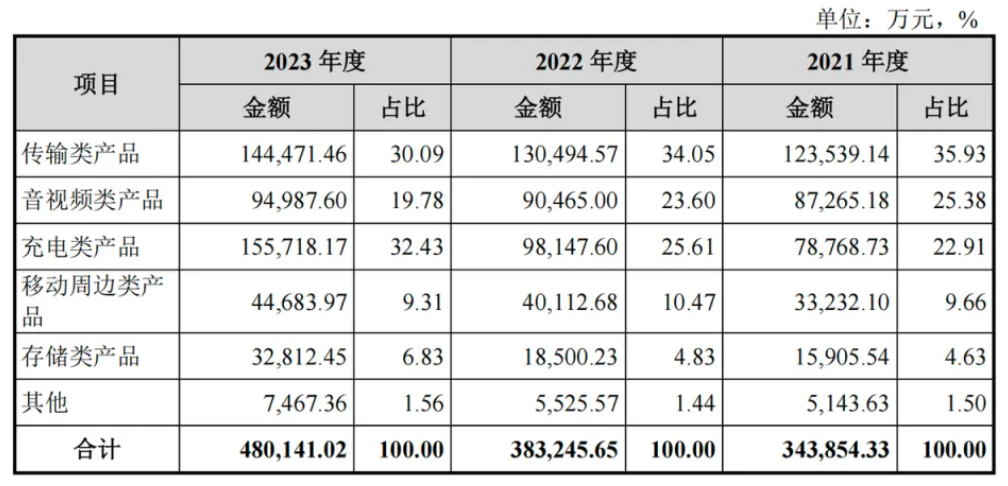 据此前披露的招股书数据,绿联科技的营业收入由2021年的34.46亿元增长至2022年的38.39亿元,同比增率达到11.40%;并于2023年进一步增至48.03亿元,增幅高达25.09%,三年内的复合年增长率为18.05%。2024年一季度营收继续迎来增长,达到了12.84亿元,同比增长高达27.06%。