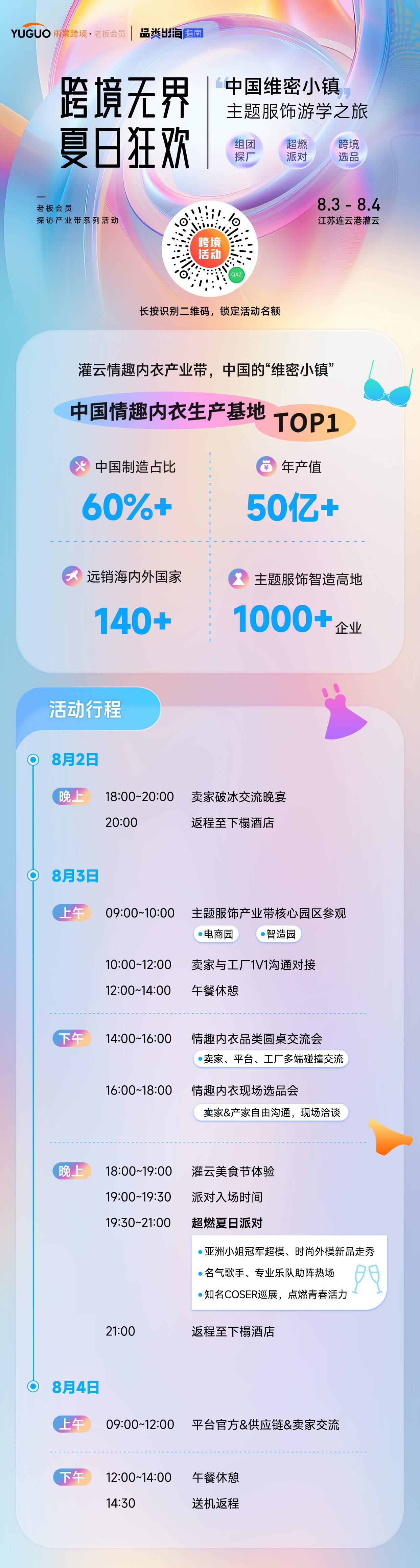 8月3日-4日,雨果将携手头部平台官方 亿级大卖,走进灌云情趣内衣及主题服饰产业带“看门道”,精准对接实力供应链!扫码即刻报名!