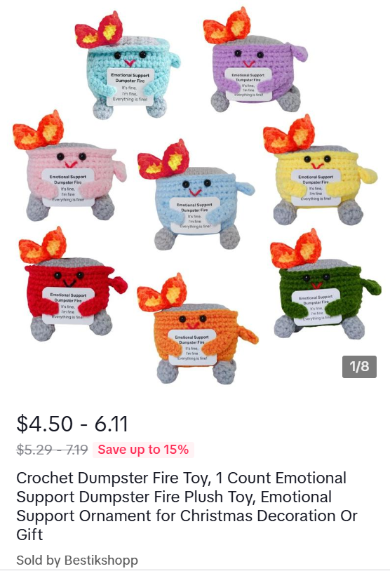 这些钩针毛绒玩偶被赋予了许多的情绪类别,成为拥有者的陪伴。其中,一款垃圾箱钩针玩具十分受欢迎。据tabcut数据显示,在过去一月内销量3.17万,销售额达12.48万美元,11月12日,单日销量达5100单。