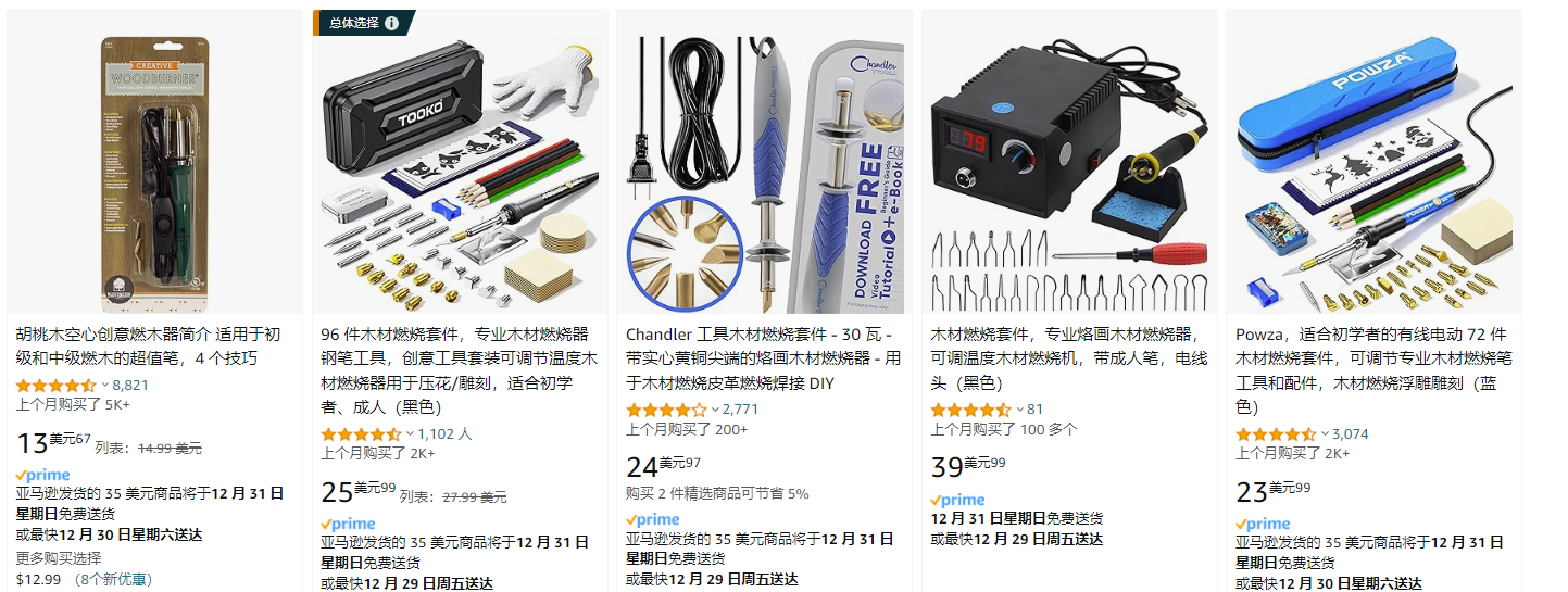 从单个木材燃烧笔、配备多款造型笔头到多样烙画模具套装,品类丰富,消费者根据需求选购,diy制作独一无二的手工艺品和礼物。海外用户在重大节日和举办派对都喜欢通过装饰和互赠礼物来庆祝,着重关注装饰diy工具,可能会发现下一个“爆品”商机。