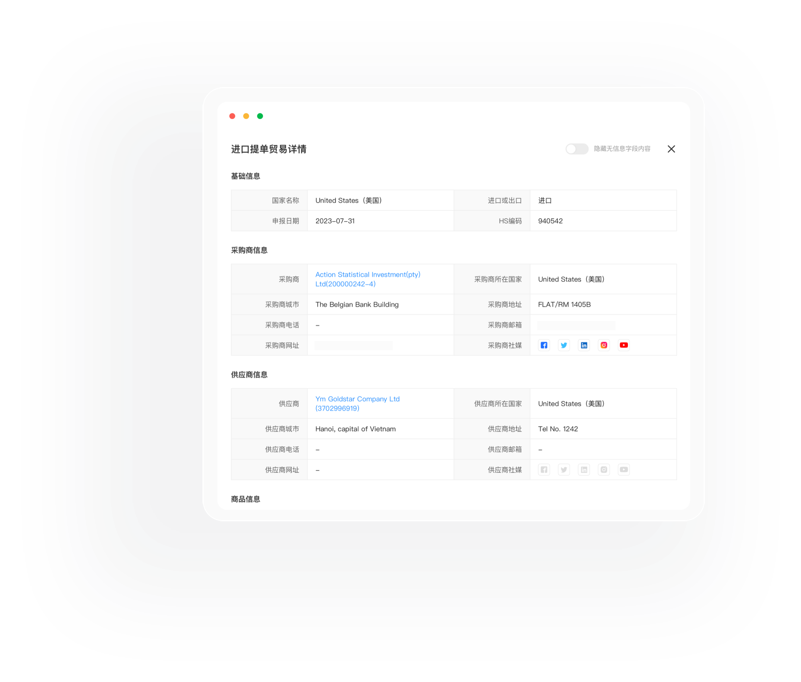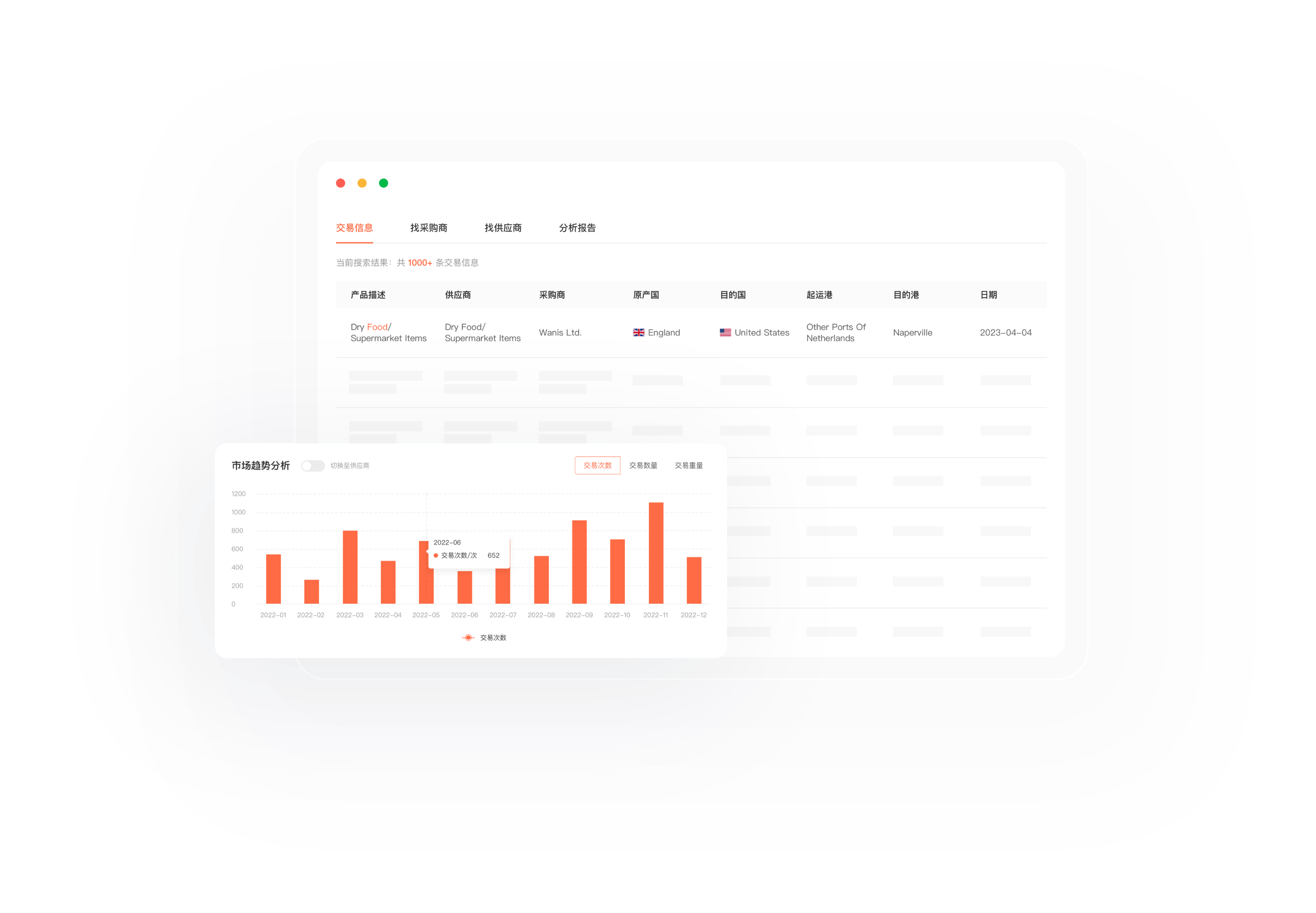轻松获取海量贸易情报,实时追踪与监控客户与同行情况,一键查询海量海关贸易数据:商品信息、交易重量、应有尽有,多重j9九游会官网登录的联系方式精准获客,助力业绩增长