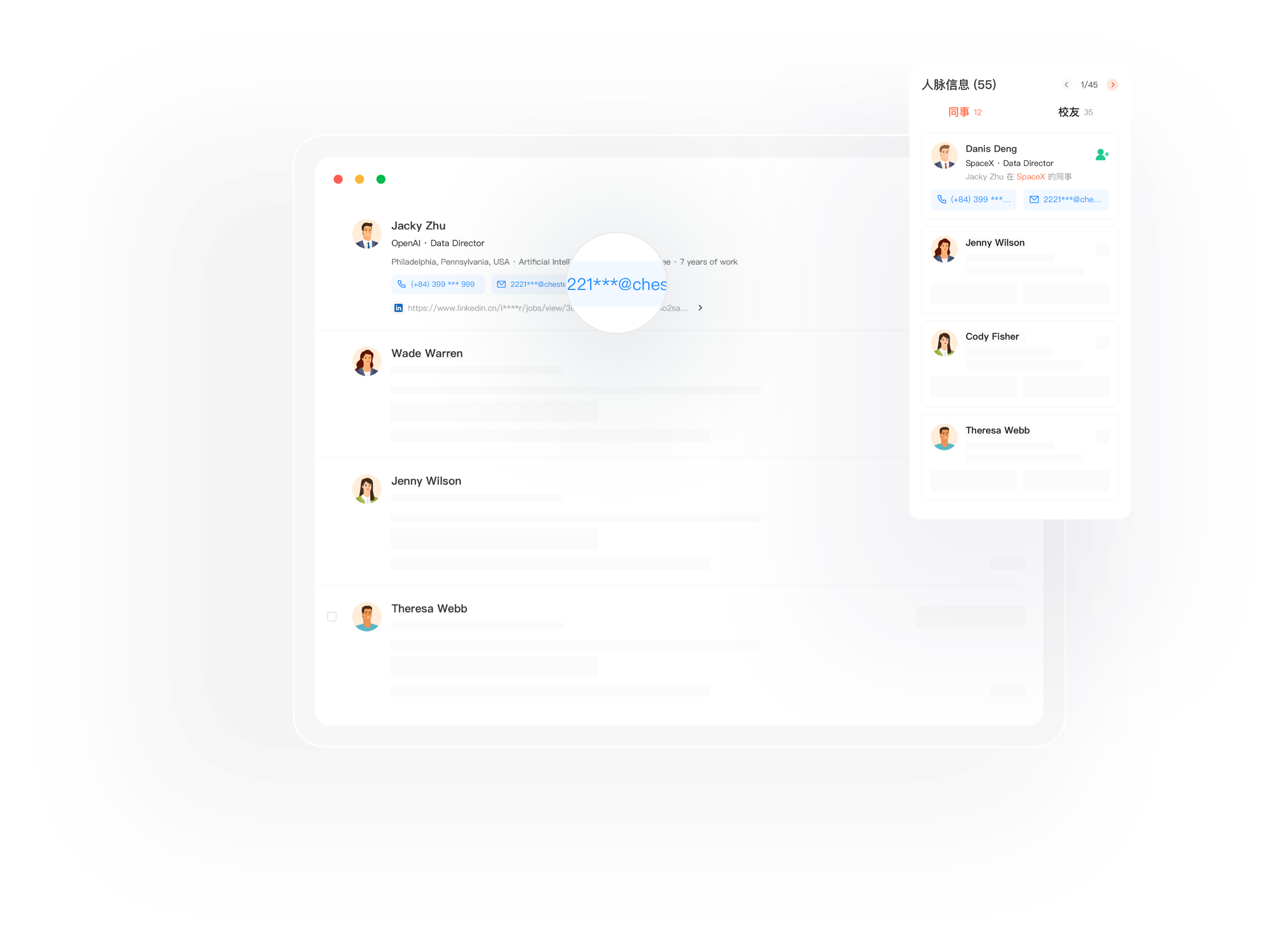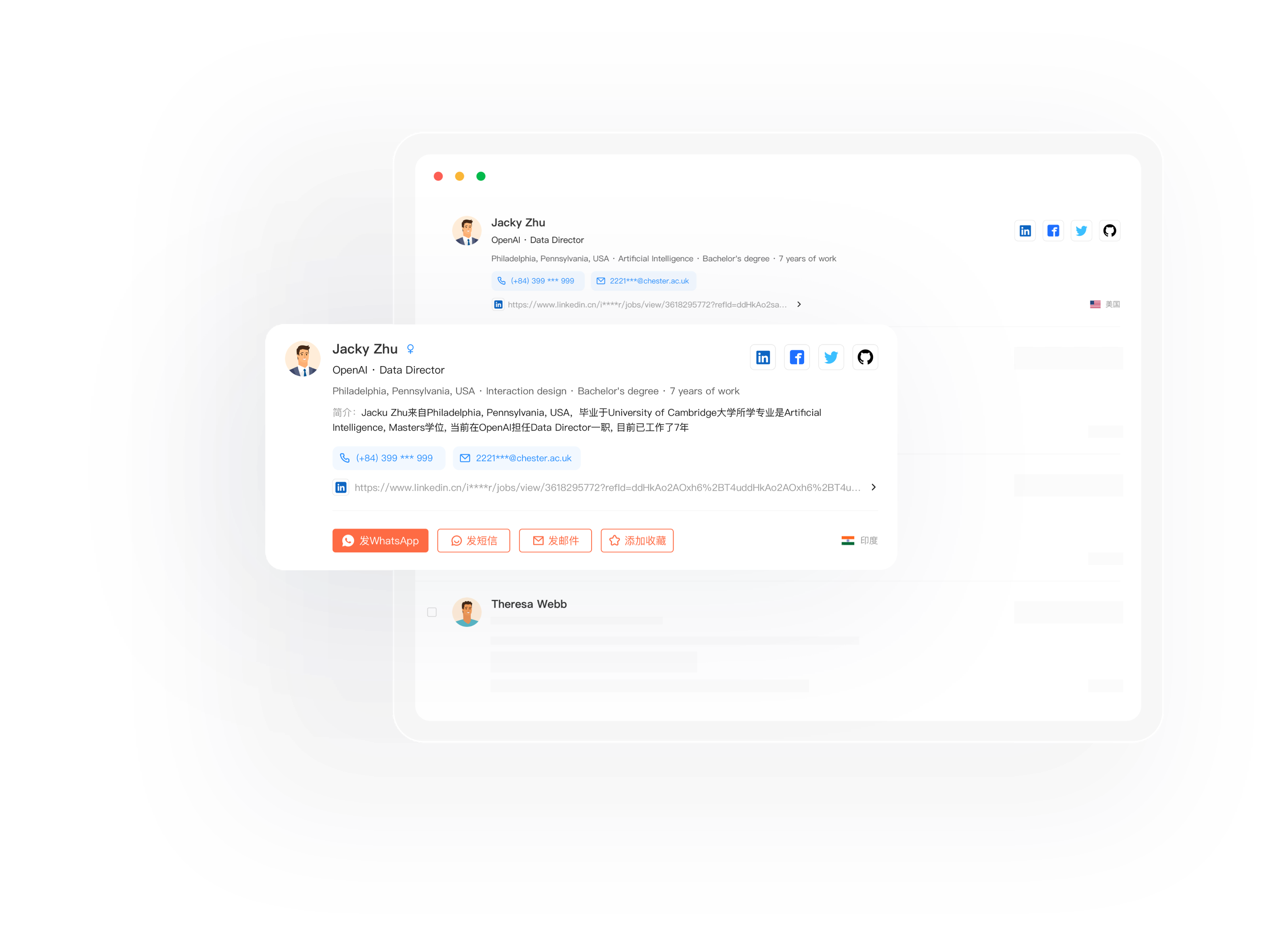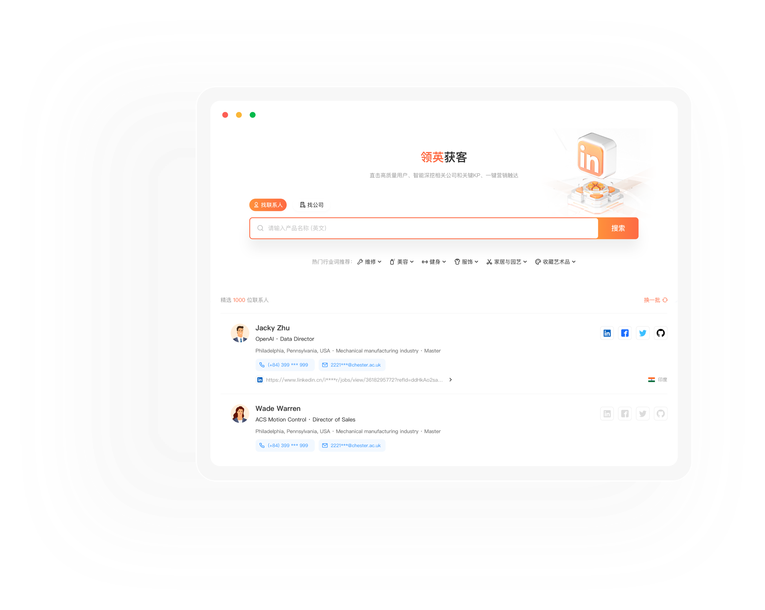 无需花费高价订阅领英会员,即可解锁全部3亿领英联系人数据。获取关键决策人的最新电话号码和电子邮件,一键发送营销信息